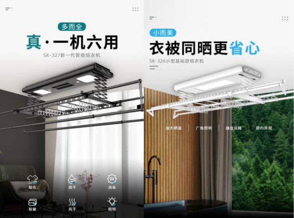 如果消费者追求更高性能的智能晾衣机,那SK-327会是一个很好的选择。SK-327由太空铝合金锻造,带有智能遥控、快速烘干、循环凉风、紫外线消杀、多重晾晒结构等功能,丰富而全面,堪称“一机六用”,且适配多种阳台。一机即可解决不够晒、晾不干、费力气等常见晾衣问题,家里有它很放心,可说是当之无愧的“阳台航舰”。纵使“回南天”不停,衣物依然能“晒”出清新干净的味道,“晒”出家居幸福感。
