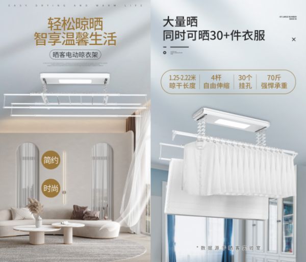 过往房子空间不足,让很多年轻人对智能晾衣机拥有“虽然很心动但是不能买”的烦恼。洞察到这方面的消费需求,晒客针对不同的家庭推出不同的晾衣机。