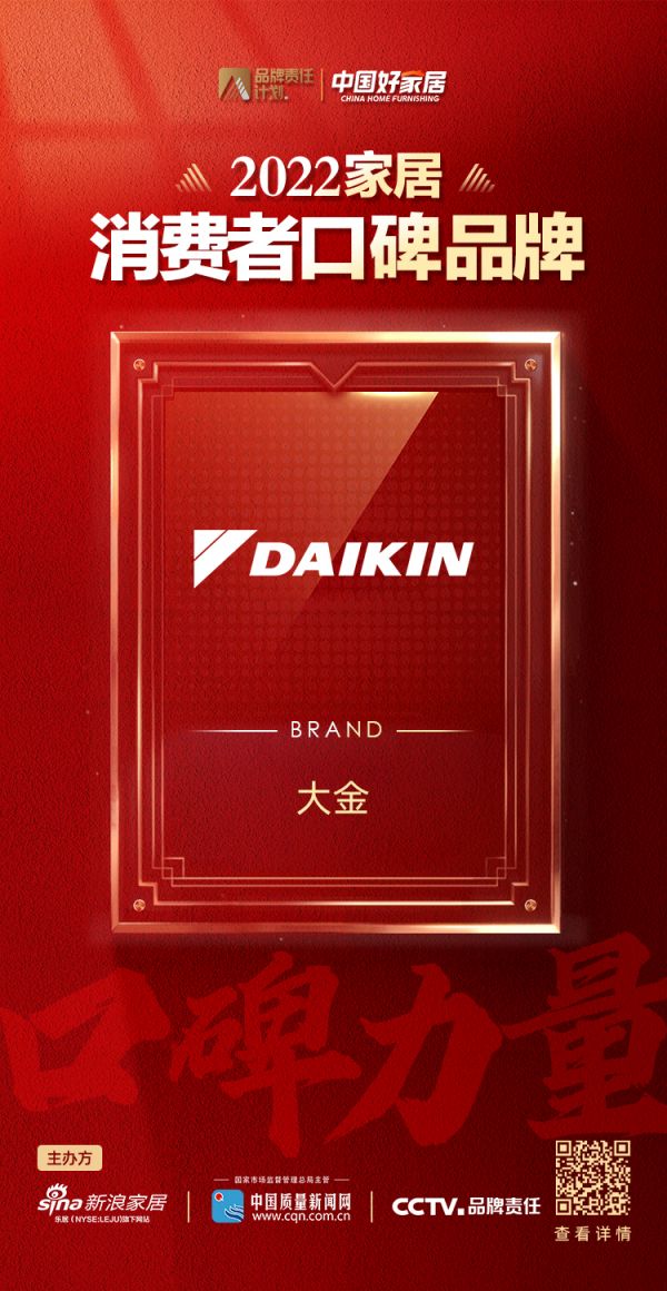 “洞悉口碑消费之下的价值驱动,用消费口碑见证品牌力量”在中国质量新闻网、CCTV品牌责任与新浪家居开展的《中国好家居——2022中国家居消费者口碑调查》活动上,全球知名企业大金空调在2600家企业品牌中脱颖而出,荣登2022家居消费者口碑品牌榜。