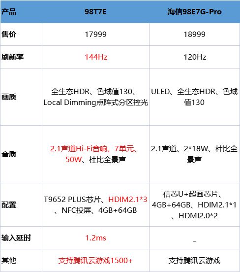 为何TCL这款高刷新品一上市就受用户的热情追捧,我们不妨拿同是高刷产品的海信98E7G-Pro和TCL 98T7E对比一下,就知道原因何在了。