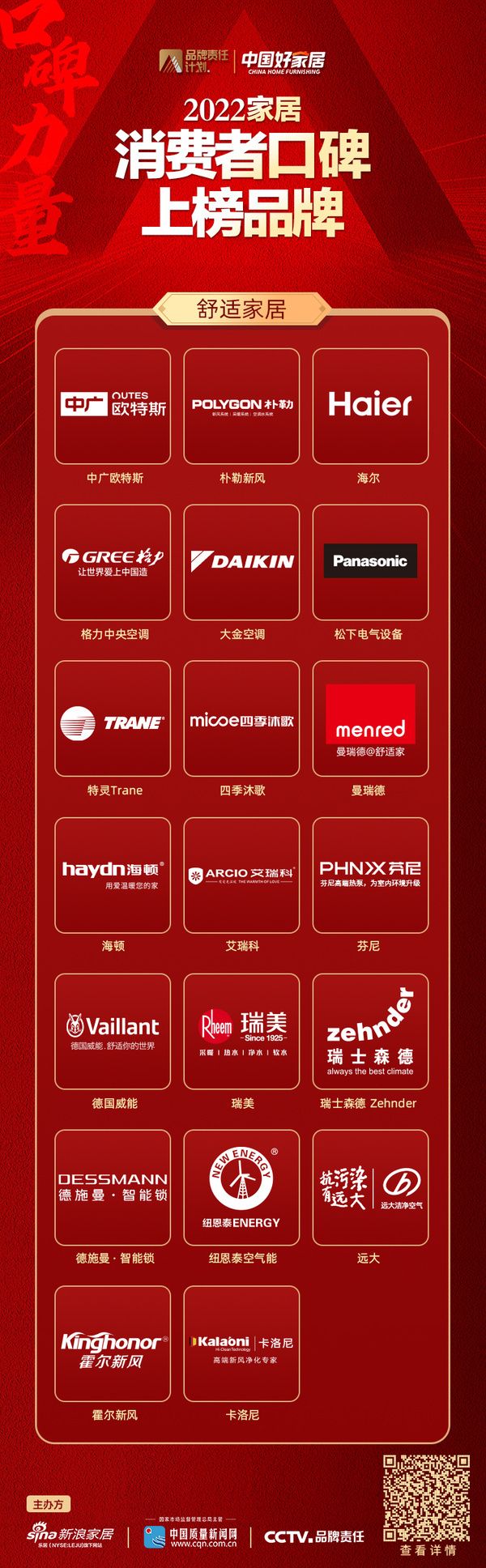 本次荣登《2022家居消费者口碑调查-物流安装交付口碑上榜品牌》中的有中广欧特斯、朴勒新风、海尔、瑞士森德zehnder、大金空调、格力中央空调、四季沐歌、松下电气设备、艾瑞科、曼瑞德共10家企业。