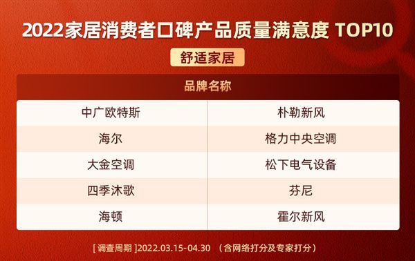 本次荣登《2022家居消费者口碑调查-产品质量口碑上榜品牌》中的有中广欧特斯、朴勒新风、海尔、格力中央空调、大金空调、松下电气设备、四季沐歌、芬尼、海顿、霍尔新风共10家企业。