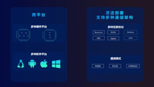 支持多种通信架构方案,实现云-云、端-云、端-端架构,有线、无线方案,离线、在线、在离线混合等灵活部署。