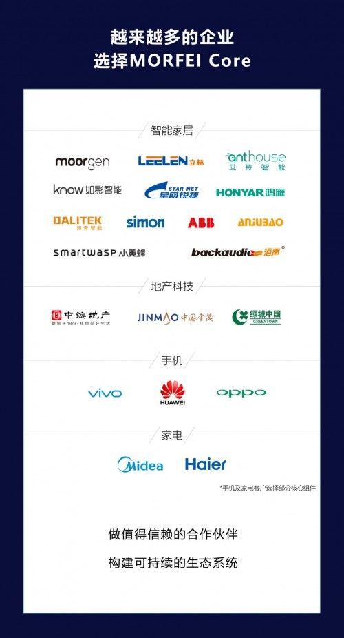 目前,已有众多智能家居设备商、地产科技公司、手机和家电企业集成MORFEI Core,推出智能中控面板、智能音箱、智能家电等系列产品,并成功应用于珠海中海寰宇天下、合肥远洋水木华著、苏州中粮天悦、合肥旭辉江山庐州印、武汉未来科技城青年社区等全屋智能标杆项目。