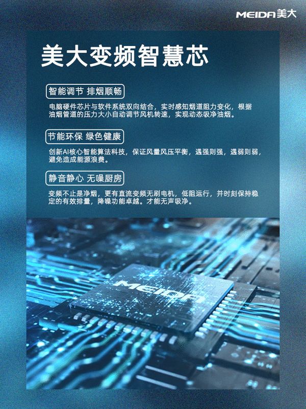 美大集成灶也在智能化的道路上有条不紊地发展中,部分产品已经具备了手势感应操作、语音智能交互等各种功能。智能化的集成灶产品十分契合时代的发展,同时美大通过不断研发和技术革新,全新推出了美大变频集成灶。搭载直流变频无刷电机,更有创新AI核心智能算法科技,实现动态风量、动态风压,排烟更顺畅、更节能、更静音。