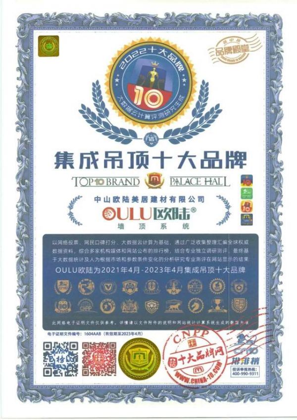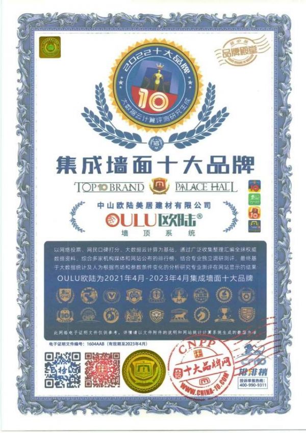 测评结果显示,OULU欧陆美居为2021年4月-2023年4月集成吊顶、墙面双十大品牌。