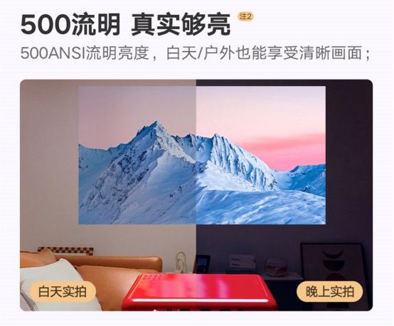分辨率方面,天猫精灵小红盒Pro具备1080P的清晰画质,并且兼容4K格式,可以投射出更加清晰的画面内容,对于一台智能微投来说,如此优异的画质表现十分难得。在500ANSI流明亮度的加持下,无论白天或是户外,都能放心使用。