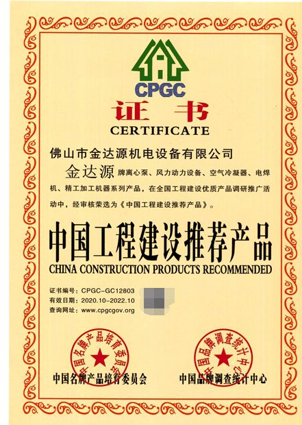 佛山市金达源机电设备有限公司荣获“中国工程建设推荐产品证书”