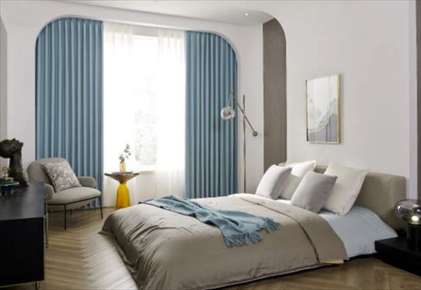 微风轻轻拂过蓝色窗帘
