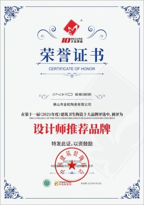 不仅如此,金舵瓷砖秉承对品质、设计和服务的追求,获得“省级高新技术企业”和“省级企业技术中心”认定,被评为2022年度家居行业服务榜样,2020年-2021年连续入选企业标准“领跑者”,2021中国家居冠军榜匠心质造品牌,2021陶瓷十大品牌以及设计师推荐品牌。