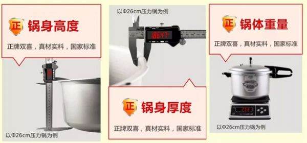 以26CM双喜小康压力锅为例,锅身的高度、厚度、锅体重量均有统一的标准,仿冒产品偷工减料减少成本,谋取暴利,损害消费者的利益。