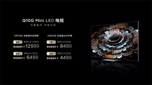 TCL万象星河Q10G Mini LED共有4款新品,5月16日开启全网预售,5月20日正式开售!85吋新品首发价12999元,75吋新品首发价8499元,65吋新品首发价6499元,55吋新品首发价4499元。