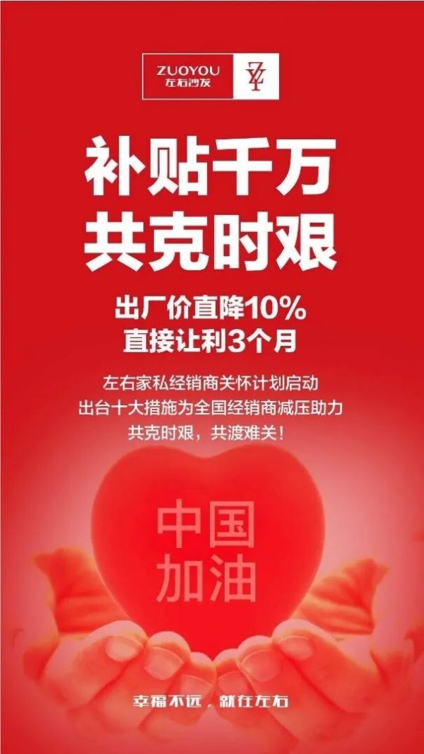 疫情爆发后,左右更在第一时间出台经销商10大关怀政策,包括产品价格下调10%,免费建立数字化门店、移动商城,提供新零售的技能培训等,与大家共克时坚、共渡难关。