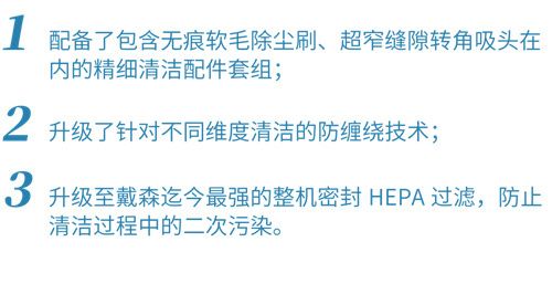 除了细节处和清洁维度上的创新升级,V12更是升级配备了戴森迄今最强的整机密封HEPA过滤系统,可吸附并锁住99.97%小至0.1微米看不见的颗粒物,并排出洁净空气,避免清洁过程中的二次污染。