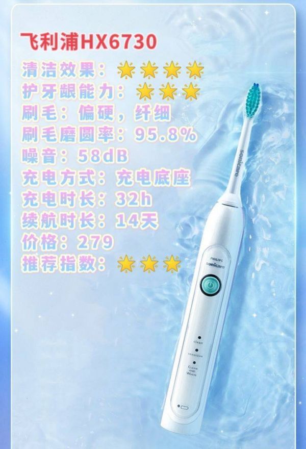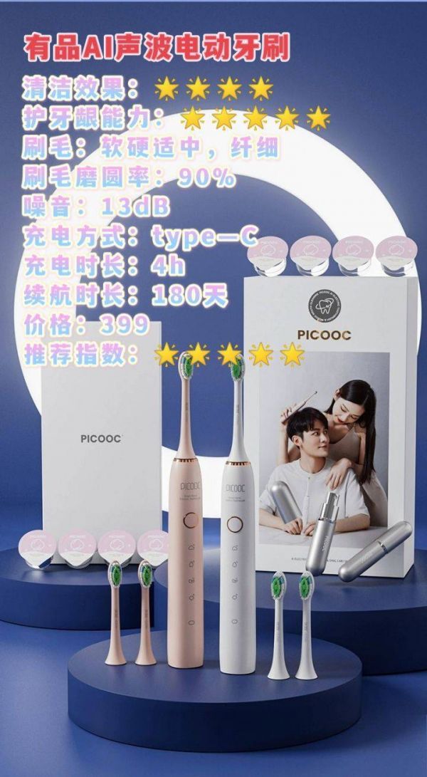 (3)超高性价比,跟价格800以上的高端电动牙刷也能正面PK。包括IPX7级全身防水、13dB超低噪音、开机三秒防甩溅、刷毛变色提醒更换、180天续航等等的完成度都能跟大牌选手们一较高下,智能调频比"高端”更用心。