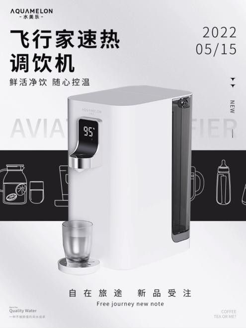 秉持不被限制的用水自由,水美乐将水质净化与智能控温融合,研发新一代净水产品,飞行家速热调饮机。