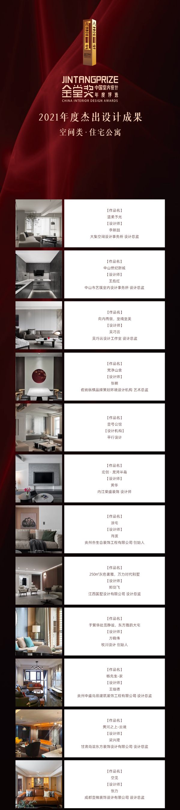 经金堂奖全国联盟、金堂奖全球评委审核通过,现正式将住宅公寓空间类获奖作品名录公布如下