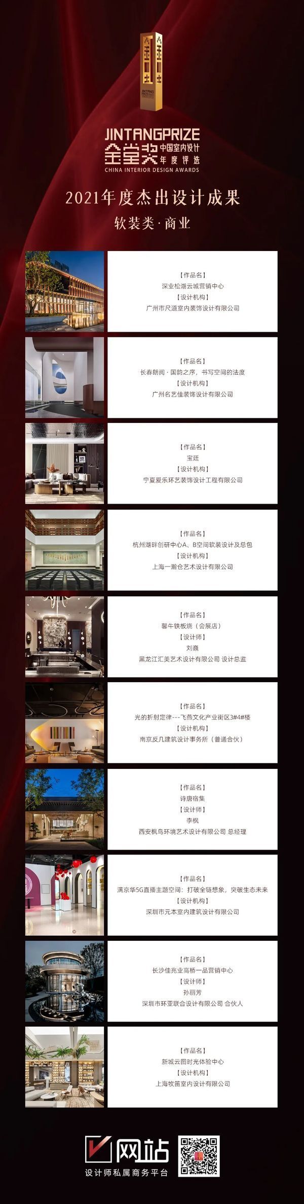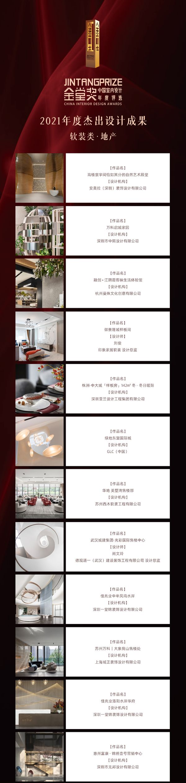 经金堂奖全国联盟、金堂奖全球评委审核通过,现正式将商业软装类、私宅软装类、地产软装类获奖作品名录公布如下:
