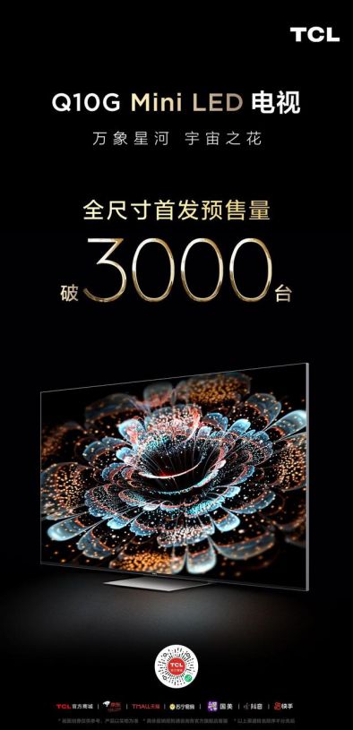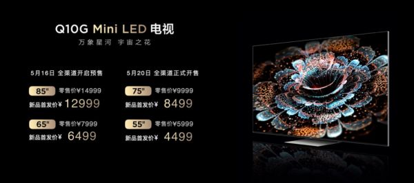 5月16日,中国电视的全球领跑者TCL正式推出了新品电视——万象星河·Q10G Mini LED电视。新品TCL Q10G电视搭载了当前电视市场的主流显示技术Mini LED,具有超高质价比。这款产品一共囊括了55/65/75/85英寸共4个尺寸,新品首发价分别是4499/6499/8499/12999元。TCL Q10G对比起其它品牌同等级的Mini LED电视,价格优势明显,堪称“价格王炸”。