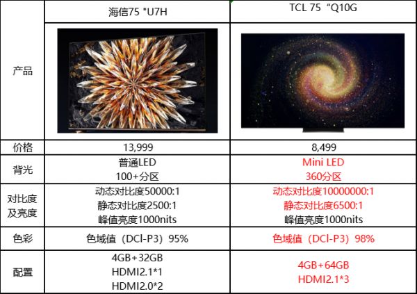 只介绍Mini LED技术,或许无法直观看出Q10G的表现,我们就拿市面上同样以出众的配置获得了市场的认可的海信75U7H对比一下,究竟哪款更值得入手呢,我们一起来看看。