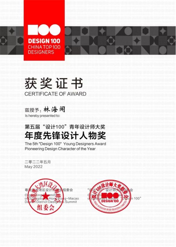 在“设计之都”这个舞台上,著名设计师、深圳市禾田设计工程有限公司(禾田营造)创始人林海闻凭借多年设计经验及高水平领导能力,荣获““设计100•年度先锋人物”称号。