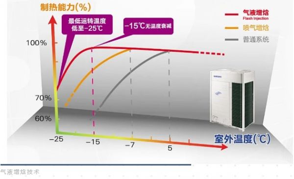 通过抽取部分中间的压力冷媒,将主循环冷媒进行过冷却提高效率的同时,显著增加了压缩机的排气量,也有效抑制了排气温度过高,使系统在寒冷气候下提升制热能力,在制冷时亦可增加冷媒量。并自动调节压缩机频率,有效提升系统满负荷及超低负荷工况下的系统效率体验出色的热力效果。
