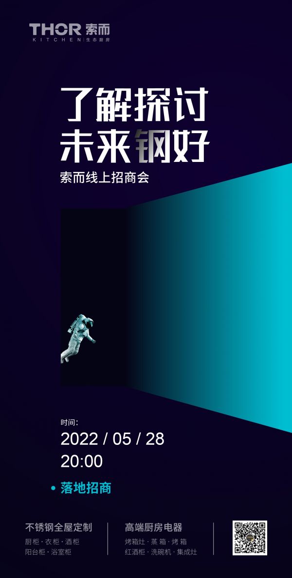 为了满足广大消费者一站式家装需求,专注于不锈钢橱柜与厨电一体化定制的生态厨房服务商、百年厨房品牌、头部高端定制家居品牌THOR索而特别开启了新一轮线上招商:2022年5月18日-5月28日,“了解探讨 索而钢好”索而线上招商会即将与广大经销商见面,为广大经销商带来全新的财富机遇。