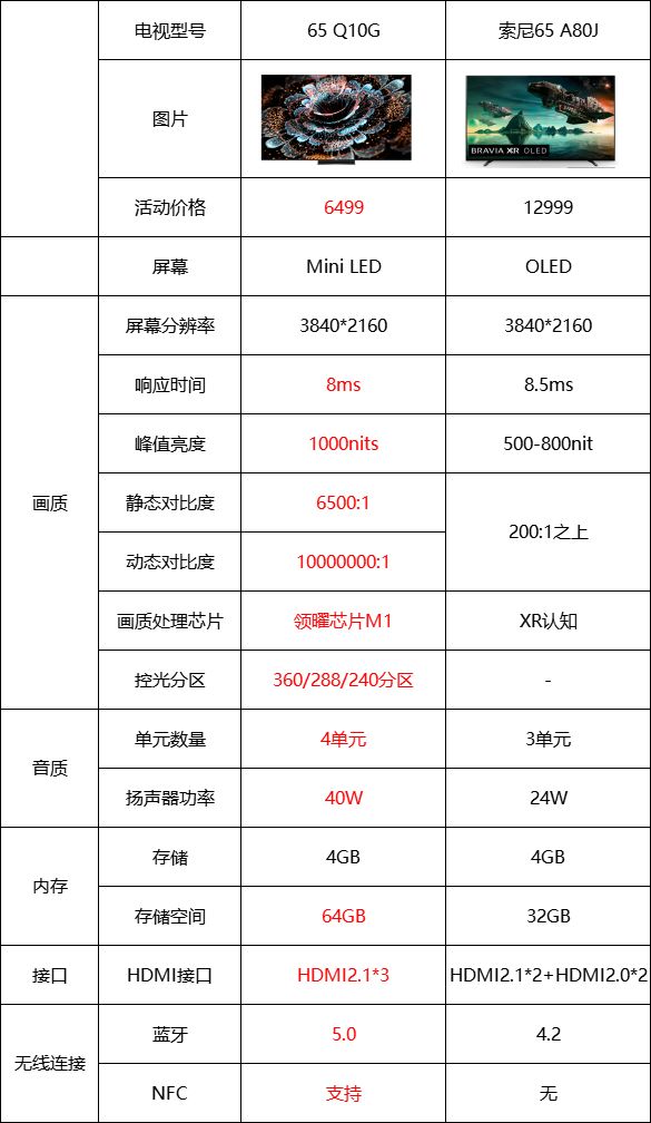 在发布会未开始前,小编本以为这款产品只是中规中矩的入门机型,但看完之后却发现Q10G的配置竟然已经能与万元价位的其他品牌旗舰电视相媲美,甚至有所超越。接下来小编就用65英寸的索尼A80J与同尺寸的TCL Q10G进行配置对比,让我们一起往下看!
