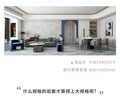 随着市场不断变化,大规格岩板越来越多,比如:750x1500mm、900x1800mm、800x2600mm、1200x2400mm、1600x2700mm等等。那么,按照目前市场流行的岩板规格展示,900x1800mm以上的岩板规格才算得上大规格。