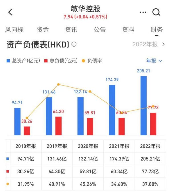 在大举扩张之下,敏华控股的负债规模也于2022财年中进一步扩大,据其2022财年年报,其总负债达到77.73亿元,为近5年来最高值,负债率为37.88%,较2021财年的负债率34.6%增长近3.3个百分点。