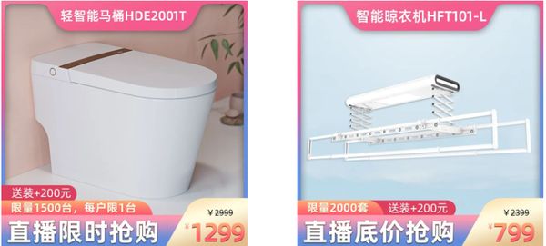 明星单品,放量开抢,浴室装修,一站搞定。在当晚直播间内,惠达卫浴旗舰智能HDE7001/魔术泡智能马桶Z30/变频智能马桶HDE3003全场好价放送;新品浴室柜、花洒、阳台柜、晾衣机等好物一应俱全,可满足您的家装多样需求。PS.部分产品直播间内下单更有精美五金赠品,以及总裁加码特别礼品,不要错过哦。