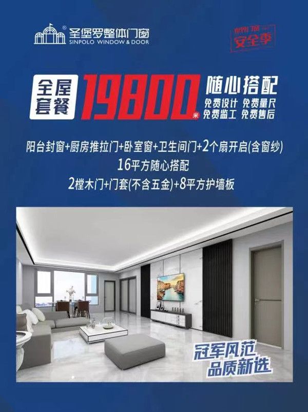据介绍,圣堡罗此次推出的19800套餐配置了系统门窗、木门、护墙板等不同品类的产品,其中系统门窗包括16㎡的阳台封窗、厨房推拉门、卧室窗、卫生间门和2个扇开启(含窗纱),消费者可根据产品品类进行更换和升级,随心搭配。