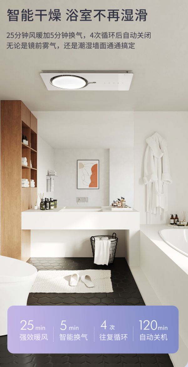 智能更是不在话下,接通于浴室所有照明灯的浴霸主机,一个开关即可掌控全场,优秀的照明带来“美颜级”体验,自拍时可以无需滤镜,一键出片,点亮你的每个高光时刻。智能干燥设置更是打造舒适升级体验,通过25分钟风暖加五分钟换气,4次循环后自动关闭,轻松带走室内潮气,浴室不再湿滑,角角落落都干净。