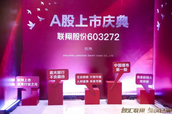 伴随着开市宝钟的锣声响起,5月20日上午9时32分,中国墙布十大品牌领绣墙布所属的浙江联翔智能家居股份有限公司,正式登陆上交所主板!公司首次公开发行A股上市,发行价格:13.64元,发行股数:2590.68万股,募集资金:3.53亿元,上市首日涨幅达到43.99%。智汇联翔,领绣已来,至此联翔股份正式成为中国墙布行业第一家上市企业,同时也是浙江海盐第7家上市公司、海盐文化产业第一股,股票代码:603272。