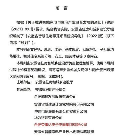 为落实《关于推进智能家电与住宅产业融合发展的通知》工作部署,加快推进智慧住宅示范项目建设,日前,由安徽省住房和城乡建设厅主编,荣事达集团参与编制的《安徽省智慧住宅示范项目建设导则》〔2022版〕正式发布。