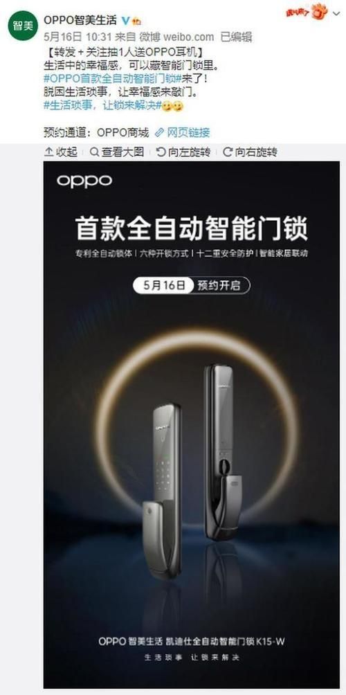 5月17日,OPPO官方旗下账号——OPPO智美生活发布了旗下首款智能全自动门锁的预约。目前这一款型号为OPPO智美生活 凯迪仕全自动智能门锁K15-W的OPPO 首款智能门锁已经开启了预约,预约价格为1999元。