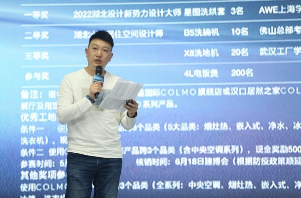 特邀湖北省室内装饰协会设计专业委员会执行主任/新浪家居设计师俱乐部秘书长肖滨,进行湖北室内空间2022创意设计大赛的发布,大赛命名为美设奖,寓意“设计未来 美舍生活”,肖主任现场对赛事的参赛要求,规则以及评选标准进行了细致的讲解,呼吁设计师进行参赛投稿,同时对美的集团武汉运营中心的大力支持表示感谢。