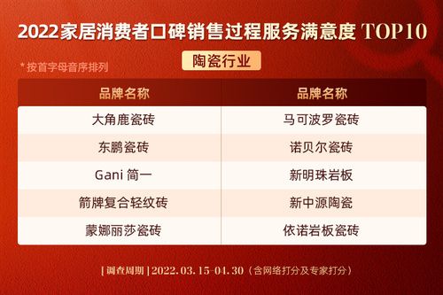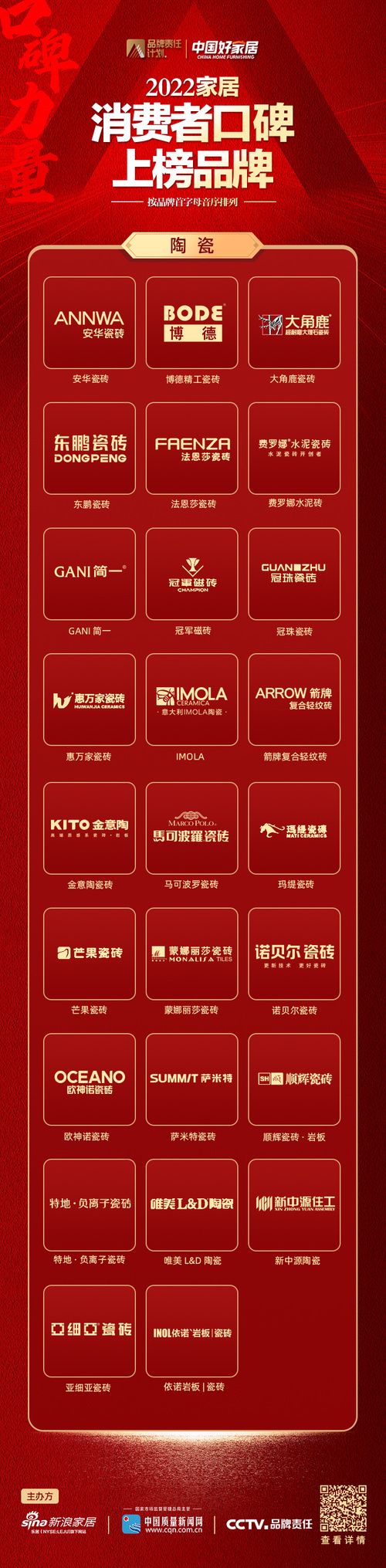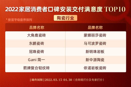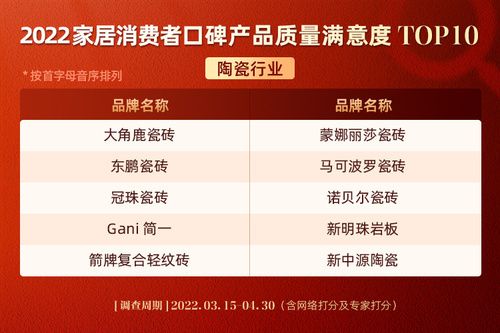 本次荣登《2022家居消费者口碑调查-产品质量满意度上榜品牌》冠珠瓷砖、Gani简一、东鹏瓷砖、箭牌复合轻纹砖、新中源陶瓷、诺贝尔瓷砖、新明珠岩板、大角鹿瓷砖、马可波罗瓷砖、蒙娜丽莎瓷砖10家企业。
