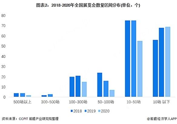 2020年,全国提供统计数据的151个展览城市中,举办展览在500场以上的有2个,在100-300场的有16个,在50-100场之间的有7个,在10-50场之间的有57个,10场以下的69个。与2019年数据相比,100场以上规模的城市大幅减少。