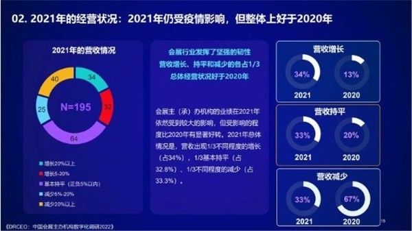 根据报告显示,90%会展主办机构的数字化转型后,2021年总体经营情况好于2020年,线上线下双线融合模式成为常态。同时疫情加速了数字化转型,超过60%的机构获得数字化收入。