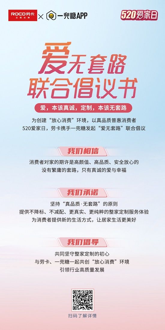 如果说为何要选择定制家居,除了家居个性化审美与表达,劳卡始终认为“爱”是人们选择定制家的最强驱动力,为爱定制家,也因此成为劳卡品牌的核心基因。在520这样标志性节日,劳卡与一兜糖家居APP联合发出“爱无套路”主张,就像是朝平静的湖面扔出了一颗石子,意味着从劳卡开始,今后将携手更多行业同仁,重新建构一个健康、放心的家居消费环境,共同坚守整家定制的初心,让大众可以“放心消费,无忧装修、安心居住”。从共情到共鸣,让人们重新认识“爱家”的重要性,并为此付出行动。