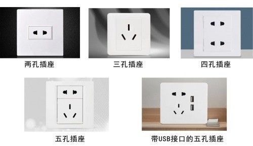 常见的有5种:两孔插座、三孔插座、四孔插座、五孔插座、带USB接口的五孔插座。
