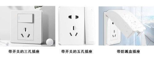 另外还有几种根据实际生活使用生活场景设计的特殊性能电源插座:带开关插座、带防溅盒插座、多功能插座。