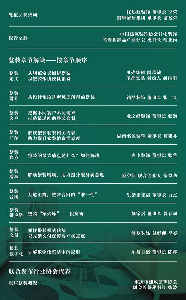 中装协住宅产业分会汇总了全国具有代表性的“整装”模式,历时一年,打造全产业研究矩阵,结合行业一线经验,给出完整准确的“整装”定义,精读消费需求、挖掘整装的本质和规律,发布会邀请十家参编单位掌门人,按照报告章节顺序进行详细解读。