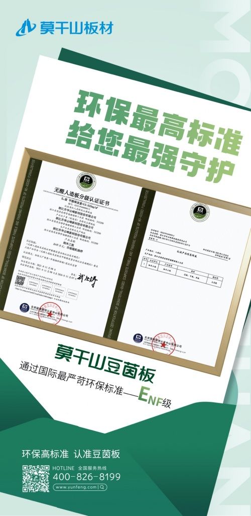 2021年11月,通过初始工厂检查、市场随机抽样检测和获证后监督的模式,依据《无醛人造板及其制品甲醛释放量分级认证技术规范》,国建联信对豆茵板的芯板、中板和单板基材以及大豆蛋白胶粘剂进行了甲醛释放量的全面检测,检测结果再次表明豆茵板完全达到了甲醛释放量≤0.025mg/m³的ENF级环保标准要求,并颁发了无醛人造板分级认证证书,准许莫干山豆茵板使用ENF分级认证标志。莫干山板材也成为行业首批获得该证书的企业。