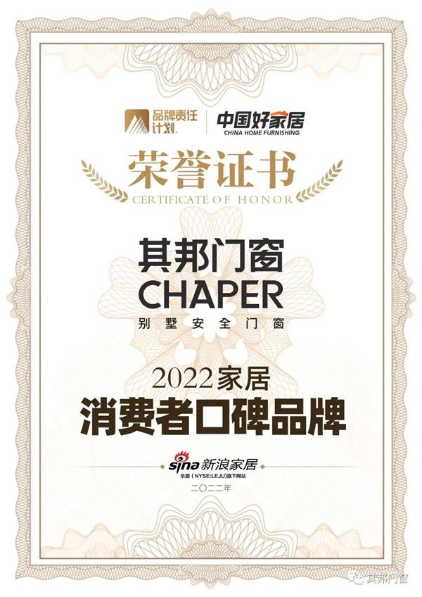 凭借着过硬的产品品质、优质的服务质量、完善的货期保障等优势,其邦门窗不负众望,荣登2022家居消费者口碑品牌榜,感谢广大消费者的认可与信赖!
