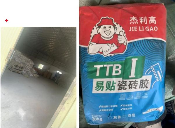 4月中旬,广东江门一窝点被查扣杰利高TTBI易贴瓷砖胶160包、杰利高TTBII瓷砖胶200包!