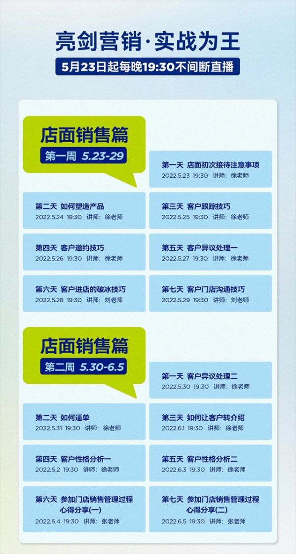 推出为期两周的店面销售精品课程: