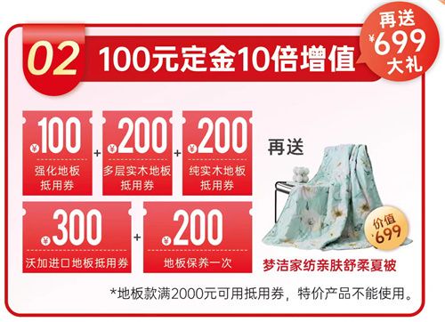 活动期间,进入“生活家精选”官方商城预交100元定金可获得1000元地板消费抵用券(100元强化地板抵用券+200元多层实木地板抵用券+200元纯实木地板抵用券+300元沃加进口地板抵用券+200元地板保养一次),同时再送699元梦洁家纺亲肤舒柔夏被。