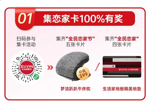 活动期间扫码进入“生活家精选”官方商城,参与“全民恋家节“集卡活动。集齐“全民恋家节”五张卡片,即可获得399元梦洁趴趴午休枕;集齐 “全民恋家”四张卡片,即可获得生活家地板精美地垫一张。集齐就送,无限制条件,诚意赠送。